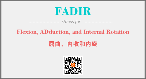 上述内容是“Flexion, ADduction, and Internal Rotation”作为“FADIR”的缩写,解释为“屈曲、内收和内旋”时的信息,以及英文缩略词FADIR所代表的英文单词,其对应的中文拼音、详细解释以及在英文中的流行度和相关分类、应用领域及应用示例等。