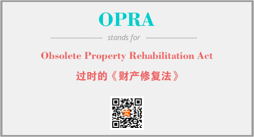 上述内容是“Obsolete Property Rehabilitation Act”作为“OPRA”的缩写,解释为“过时的《财产修复法》”时的信息,以及英文缩略词OPRA所代表的英文单词,其对应的中文拼音、详细解释以及在英文中的流行度和相关分类、应用领域及应用示例等。