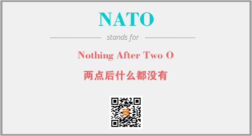 上述内容是“Nothing After Two O”作为“NATO”的缩写,解释为“两点后什么都没有”时的信息,以及英文缩略词NATO所代表的英文单词,其对应的中文拼音、详细解释以及在英文中的流行度和相关分类、应用领域及应用示例等。
