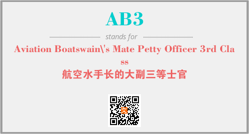 上述内容是“Aviation Boatswain\'s Mate Petty Officer 3rd Class”作为“AB3”的缩写,解释为“航空水手长的大副三等士官”时的信息,以及英文缩略词AB3所代表的英文单词,其对应的中文拼音、详细解释以及在英文中的流行度和相关分类、应用领域及应用示例等。