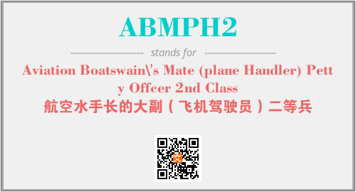 英文缩略词“ABMPH2”经常作为“Aviation Boatswain\'s Mate (plane Handler) Petty Offcer 2nd Class”的英文缩写来使用,中文表示:“航空水手长的大副(飞机驾驶员)二等兵”。本文将详细介绍英文缩写词ABMPH2所代表英文单词,其对应的中文拼音、详细解释以及在英语中的流行度。此外,还有关于缩略词ABMPH2的分类、应用领域及相关应用示例等。