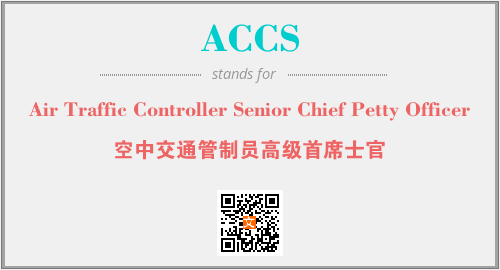 上述内容是“Air Traffic Controller Senior Chief Petty Officer”作为“ACCS”的缩写,解释为“空中交通管制员高级首席士官”时的信息,以及英文缩略词ACCS所代表的英文单词,其对应的中文拼音、详细解释以及在英文中的流行度和相关分类、应用领域及应用示例等。