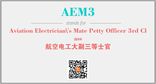 上述内容是“Aviation Electrician\'s Mate Petty Officer 3rd Class”作为“AEM3”的缩写,解释为“航空电工大副三等士官”时的信息,以及英文缩略词AEM3所代表的英文单词,其对应的中文拼音、详细解释以及在英文中的流行度和相关分类、应用领域及应用示例等。