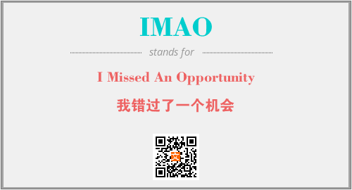 上述内容是“I Missed An Opportunity”作为“IMAO”的缩写,解释为“我错过了一个机会”时的信息,以及英文缩略词IMAO所代表的英文单词,其对应的中文拼音、详细解释以及在英文中的流行度和相关分类、应用领域及应用示例等。