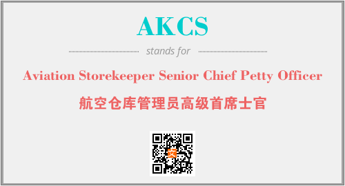 上述内容是“Aviation Storekeeper Senior Chief Petty Officer”作为“AKCS”的缩写,解释为“航空仓库管理员高级首席士官”时的信息,以及英文缩略词AKCS所代表的英文单词,其对应的中文拼音、详细解释以及在英文中的流行度和相关分类、应用领域及应用示例等。