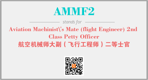 上述内容是“Aviation Machinist\'s Mate (flight Engineer) 2nd Class Petty Officer”作为“AMMF2”的缩写,解释为“航空机械师大副(飞行工程师)二等士官”时的信息,以及英文缩略词AMMF2所代表的英文单词,其对应的中文拼音、详细解释以及在英文中的流行度和相关分类、应用领域及应用示例等。