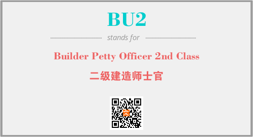 上述内容是“Builder Petty Officer 2nd Class”作为“BU2”的缩写,解释为“二级建造师士官”时的信息,以及英文缩略词BU2所代表的英文单词,其对应的中文拼音、详细解释以及在英文中的流行度和相关分类、应用领域及应用示例等。