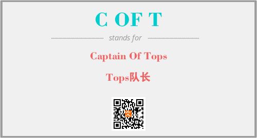 英文缩略词“C OF T”经常作为“Captain Of Tops”的英文缩写来使用,中文表示:“Tops队长”。本文将详细介绍英文缩写词C OF T所代表英文单词,其对应的中文拼音、详细解释以及在英语中的流行度。此外,还有关于缩略词C OF T的分类、应用领域及相关应用示例等。