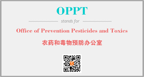 英文缩略词“OPPT”经常作为“Office of Prevention Pesticides and Toxics”的英文缩写来使用,中文表示:“农药和毒物预防办公室”。本文将详细介绍英文缩写词OPPT所代表英文单词,其对应的中文拼音、详细解释以及在英语中的流行度。此外,还有关于缩略词OPPT的分类、应用领域及相关应用示例等。