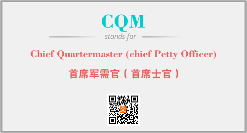 英文缩略词“CQM”经常作为“Chief Quartermaster (chief Petty Officer)”的英文缩写来使用,中文表示:“首席军需官(首席士官)”。本文将详细介绍英文缩写词CQM所代表英文单词,其对应的中文拼音、详细解释以及在英语中的流行度。此外,还有关于缩略词CQM的分类、应用领域及相关应用示例等。