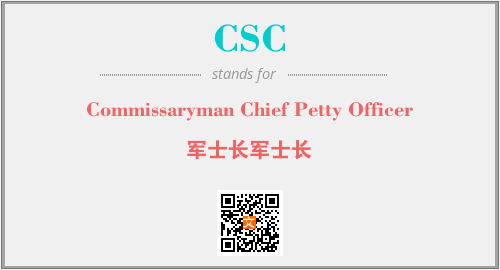 英文缩略词“CSC”经常作为“Commissaryman Chief Petty Officer”的英文缩写来使用,中文表示:“军士长军士长”。本文将详细介绍英文缩写词CSC所代表英文单词,其对应的中文拼音、详细解释以及在英语中的流行度。此外,还有关于缩略词CSC的分类、应用领域及相关应用示例等。