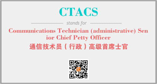 英文缩略词“CTACS”经常作为“Communications Technician (administrative) Senior Chief Petty Officer”的英文缩写来使用,中文表示:“通信技术员(行政)高级首席士官”。本文将详细介绍英文缩写词CTACS所代表英文单词,其对应的中文拼音、详细解释以及在英语中的流行度。此外,还有关于缩略词CTACS的分类、应用领域及相关应用示例等。