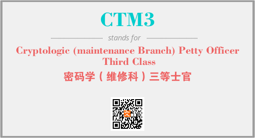 上述内容是“Cryptologic (maintenance Branch) Petty Officer Third Class”作为“CTM3”的缩写,解释为“密码学(维修科)三等士官”时的信息,以及英文缩略词CTM3所代表的英文单词,其对应的中文拼音、详细解释以及在英文中的流行度和相关分类、应用领域及应用示例等。