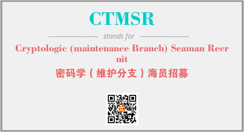 英文缩略词“CTMSR”经常作为“Cryptologic (maintenance Branch) Seaman Recruit”的英文缩写来使用,中文表示:“密码学(维护分支)海员招募”。本文将详细介绍英文缩写词CTMSR所代表英文单词,其对应的中文拼音、详细解释以及在英语中的流行度。此外,还有关于缩略词CTMSR的分类、应用领域及相关应用示例等。