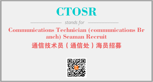 英文缩略词“CTOSR”经常作为“Communications Technician (communications Branch) Seaman Recruit”的英文缩写来使用,中文表示:“通信技术员(通信处)海员招募”。本文将详细介绍英文缩写词CTOSR所代表英文单词,其对应的中文拼音、详细解释以及在英语中的流行度。此外,还有关于缩略词CTOSR的分类、应用领域及相关应用示例等。