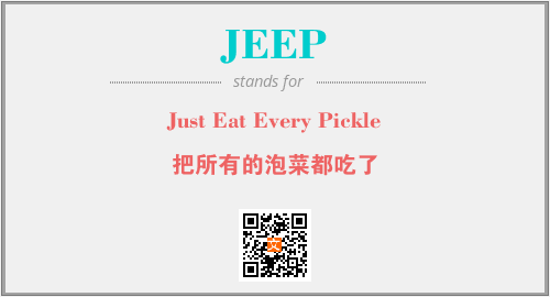 英文缩略词“JEEP”经常作为“Just Eat Every Pickle”的英文缩写来使用,中文表示:“把所有的泡菜都吃了”。本文将详细介绍英文缩写词JEEP所代表英文单词,其对应的中文拼音、详细解释以及在英语中的流行度。此外,还有关于缩略词JEEP的分类、应用领域及相关应用示例等。