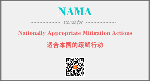 上述内容是“Nationally Appropriate Mitigation Actions”作为“NAMA”的缩写,解释为“适合本国的缓解行动”时的信息,以及英文缩略词NAMA所代表的英文单词,其对应的中文拼音、详细解释以及在英文中的流行度和相关分类、应用领域及应用示例等。