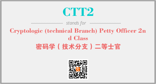 英文缩略词“CTT2”经常作为“Cryptologic (technical Branch) Petty Officer 2nd Class”的英文缩写来使用,中文表示:“密码学(技术分支)二等士官”。本文将详细介绍英文缩写词CTT2所代表英文单词,其对应的中文拼音、详细解释以及在英语中的流行度。此外,还有关于缩略词CTT2的分类、应用领域及相关应用示例等。