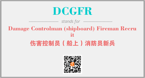 英文缩略词“DCGFR”经常作为“Damage Controlman (shipboard) Fireman Recruit”的英文缩写来使用,中文表示:“伤害控制员(船上)消防员新兵”。本文将详细介绍英文缩写词DCGFR所代表英文单词,其对应的中文拼音、详细解释以及在英语中的流行度。此外,还有关于缩略词DCGFR的分类、应用领域及相关应用示例等。