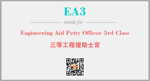 上述内容是“Engineering Aid Petty Officer 3rd Class”作为“EA3”的缩写,解释为“三等工程援助士官”时的信息,以及英文缩略词EA3所代表的英文单词,其对应的中文拼音、详细解释以及在英文中的流行度和相关分类、应用领域及应用示例等。