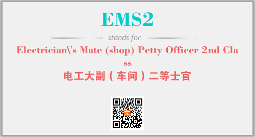 上述内容是“Electrician\'s Mate (shop) Petty Officer 2nd Class”作为“EMS2”的缩写,解释为“电工大副(车间)二等士官”时的信息,以及英文缩略词EMS2所代表的英文单词,其对应的中文拼音、详细解释以及在英文中的流行度和相关分类、应用领域及应用示例等。