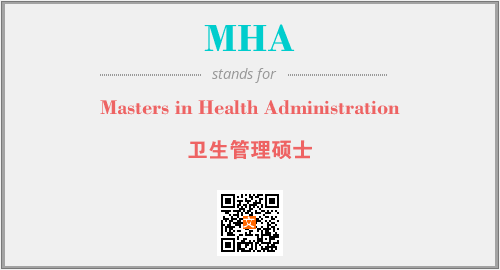 英文缩略词“MHA”经常作为“Masters in Health Administration”的英文缩写来使用,中文表示:“卫生管理硕士”。本文将详细介绍英文缩写词MHA所代表英文单词,其对应的中文拼音、详细解释以及在英语中的流行度。此外,还有关于缩略词MHA的分类、应用领域及相关应用示例等。