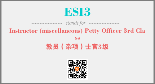上述内容是“Instructor (miscellaneous) Petty Officer 3rd Class”作为“ESI3”的缩写,解释为“教员(杂项)士官3级”时的信息,以及英文缩略词ESI3所代表的英文单词,其对应的中文拼音、详细解释以及在英文中的流行度和相关分类、应用领域及应用示例等。