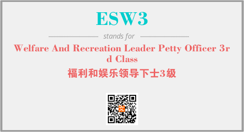 英文缩略词“ESW3”经常作为“Welfare And Recreation Leader Petty Officer 3rd Class”的英文缩写来使用,中文表示:“福利和娱乐领导下士3级”。本文将详细介绍英文缩写词ESW3所代表英文单词,其对应的中文拼音、详细解释以及在英语中的流行度。此外,还有关于缩略词ESW3的分类、应用领域及相关应用示例等。