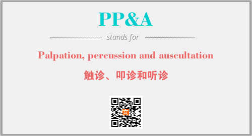 上述内容是“Palpation, percussion and auscultation”作为“PP&A”的缩写,解释为“触诊、叩诊和听诊”时的信息,以及英文缩略词PP&A所代表的英文单词,其对应的中文拼音、详细解释以及在英文中的流行度和相关分类、应用领域及应用示例等。