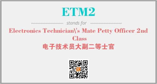 上述内容是“Electronics Technician\'s Mate Petty Officer 2nd Class”作为“ETM2”的缩写,解释为“电子技术员大副二等士官”时的信息,以及英文缩略词ETM2所代表的英文单词,其对应的中文拼音、详细解释以及在英文中的流行度和相关分类、应用领域及应用示例等。