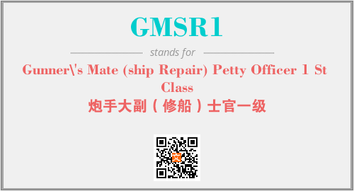 上述内容是“Gunner\'s Mate (ship Repair) Petty Officer 1 St Class”作为“GMSR1”的缩写,解释为“炮手大副(修船)士官一级”时的信息,以及英文缩略词GMSR1所代表的英文单词,其对应的中文拼音、详细解释以及在英文中的流行度和相关分类、应用领域及应用示例等。