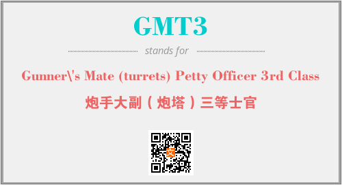 上述内容是“Gunner\'s Mate (turrets) Petty Officer 3rd Class”作为“GMT3”的缩写,解释为“炮手大副(炮塔)三等士官”时的信息,以及英文缩略词GMT3所代表的英文单词,其对应的中文拼音、详细解释以及在英文中的流行度和相关分类、应用领域及应用示例等。