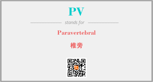 上述内容是“Paravertebral”作为“PV”的缩写,解释为“椎旁”时的信息,以及英文缩略词PV所代表的英文单词,其对应的中文拼音、详细解释以及在英文中的流行度和相关分类、应用领域及应用示例等。