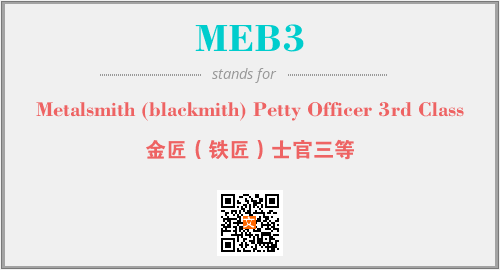 上述内容是“Metalsmith (blackmith) Petty Officer 3rd Class”作为“MEB3”的缩写,解释为“金匠(铁匠)士官三等”时的信息,以及英文缩略词MEB3所代表的英文单词,其对应的中文拼音、详细解释以及在英文中的流行度和相关分类、应用领域及应用示例等。