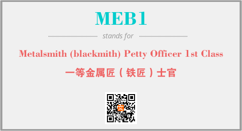 英文缩略词“MEB1”经常作为“Metalsmith (blackmith) Petty Officer 1st Class”的英文缩写来使用,中文表示:“一等金属匠(铁匠)士官”。本文将详细介绍英文缩写词MEB1所代表英文单词,其对应的中文拼音、详细解释以及在英语中的流行度。此外,还有关于缩略词MEB1的分类、应用领域及相关应用示例等。