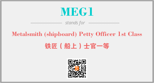 上述内容是“Metalsmith (shipboard) Petty Officer 1st Class”作为“MEG1”的缩写,解释为“铁匠(船上)士官一等”时的信息,以及英文缩略词MEG1所代表的英文单词,其对应的中文拼音、详细解释以及在英文中的流行度和相关分类、应用领域及应用示例等。