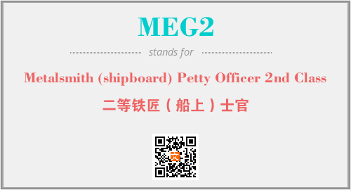 英文缩略词“MEG2”经常作为“Metalsmith (shipboard) Petty Officer 2nd Class”的英文缩写来使用,中文表示:“二等铁匠(船上)士官”。本文将详细介绍英文缩写词MEG2所代表英文单词,其对应的中文拼音、详细解释以及在英语中的流行度。此外,还有关于缩略词MEG2的分类、应用领域及相关应用示例等。