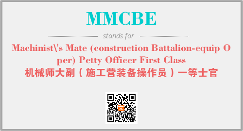 英文缩略词“MMCBE”经常作为“Machinist\'s Mate (construction Battalion-equip Oper) Petty Officer First Class”的英文缩写来使用,中文表示:“机械师大副(施工营装备操作员)一等士官”。本文将详细介绍英文缩写词MMCBE所代表英文单词,其对应的中文拼音、详细解释以及在英语中的流行度。此外,还有关于缩略词MMCBE的分类、应用领域及相关应用示例等。