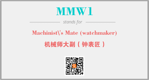 英文缩略词“MMW1”经常作为“Machinist\'s Mate (watchmaker)”的英文缩写来使用,中文表示:“机械师大副(钟表匠)”。本文将详细介绍英文缩写词MMW1所代表英文单词,其对应的中文拼音、详细解释以及在英语中的流行度。此外,还有关于缩略词MMW1的分类、应用领域及相关应用示例等。