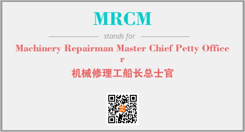 英文缩略词“MRCM”经常作为“Machinery Repairman Master Chief Petty Officer”的英文缩写来使用,中文表示:“机械修理工船长总士官”。本文将详细介绍英文缩写词MRCM所代表英文单词,其对应的中文拼音、详细解释以及在英语中的流行度。此外,还有关于缩略词MRCM的分类、应用领域及相关应用示例等。