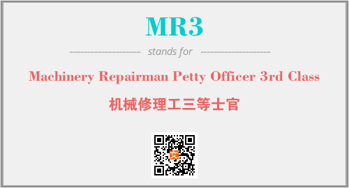 上述内容是“Machinery Repairman Petty Officer 3rd Class”作为“MR3”的缩写,解释为“机械修理工三等士官”时的信息,以及英文缩略词MR3所代表的英文单词,其对应的中文拼音、详细解释以及在英文中的流行度和相关分类、应用领域及应用示例等。