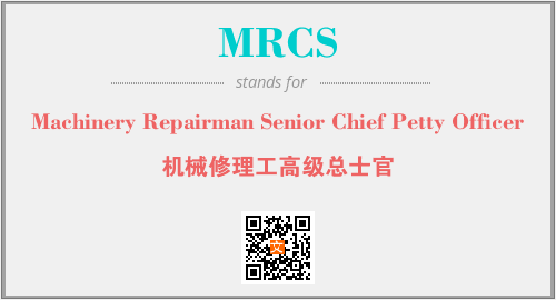 上述内容是“Machinery Repairman Senior Chief Petty Officer”作为“MRCS”的缩写,解释为“机械修理工高级总士官”时的信息,以及英文缩略词MRCS所代表的英文单词,其对应的中文拼音、详细解释以及在英文中的流行度和相关分类、应用领域及应用示例等。