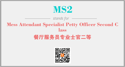 上述内容是“Mess Attendant Specialist Petty Officer Second Class”作为“MS2”的缩写,解释为“餐厅服务员专业士官二等”时的信息,以及英文缩略词MS2所代表的英文单词,其对应的中文拼音、详细解释以及在英文中的流行度和相关分类、应用领域及应用示例等。