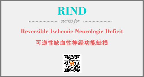 上述内容是“Reversible Ischemic Neurologic Deficit”作为“RIND”的缩写,解释为“可逆性缺血性神经功能缺损”时的信息,以及英文缩略词RIND所代表的英文单词,其对应的中文拼音、详细解释以及在英文中的流行度和相关分类、应用领域及应用示例等。