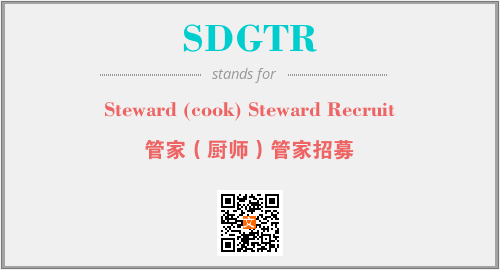 上述内容是“Steward (cook) Steward Recruit”作为“SDGTR”的缩写,解释为“管家(厨师)管家招募”时的信息,以及英文缩略词SDGTR所代表的英文单词,其对应的中文拼音、详细解释以及在英文中的流行度和相关分类、应用领域及应用示例等。