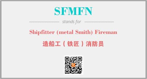 上述内容是“Shipfitter (metal Smith) Fireman”作为“SFMFN”的缩写,解释为“造船工(铁匠)消防员”时的信息,以及英文缩略词SFMFN所代表的英文单词,其对应的中文拼音、详细解释以及在英文中的流行度和相关分类、应用领域及应用示例等。