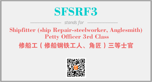 上述内容是“Shipfitter (ship Repair-steelworker, Anglesmith) Petty Officer 3rd Class”作为“SFSRF3”的缩写,解释为“修船工(修船钢铁工人、角匠)三等士官”时的信息,以及英文缩略词SFSRF3所代表的英文单词,其对应的中文拼音、详细解释以及在英文中的流行度和相关分类、应用领域及应用示例等。