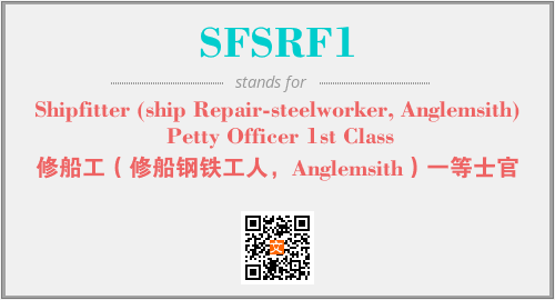 英文缩略词“SFSRF1”经常作为“Shipfitter (ship Repair-steelworker, Anglemsith) Petty Officer 1st Class”的英文缩写来使用,中文表示:“修船工(修船钢铁工人,Anglemsith)一等士官”。本文将详细介绍英文缩写词SFSRF1所代表英文单词,其对应的中文拼音、详细解释以及在英语中的流行度。此外,还有关于缩略词SFSRF1的分类、应用领域及相关应用示例等。