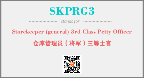 英文缩略词“SKPRG3”经常作为“Storekeeper (general) 3rd Class Petty Officer”的英文缩写来使用,中文表示:“仓库管理员(将军)三等士官”。本文将详细介绍英文缩写词SKPRG3所代表英文单词,其对应的中文拼音、详细解释以及在英语中的流行度。此外,还有关于缩略词SKPRG3的分类、应用领域及相关应用示例等。