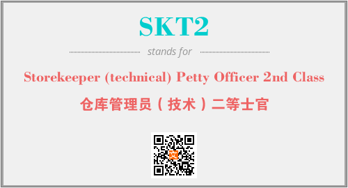 上述内容是“Storekeeper (technical) Petty Officer 2nd Class”作为“SKT2”的缩写,解释为“仓库管理员(技术)二等士官”时的信息,以及英文缩略词SKT2所代表的英文单词,其对应的中文拼音、详细解释以及在英文中的流行度和相关分类、应用领域及应用示例等。